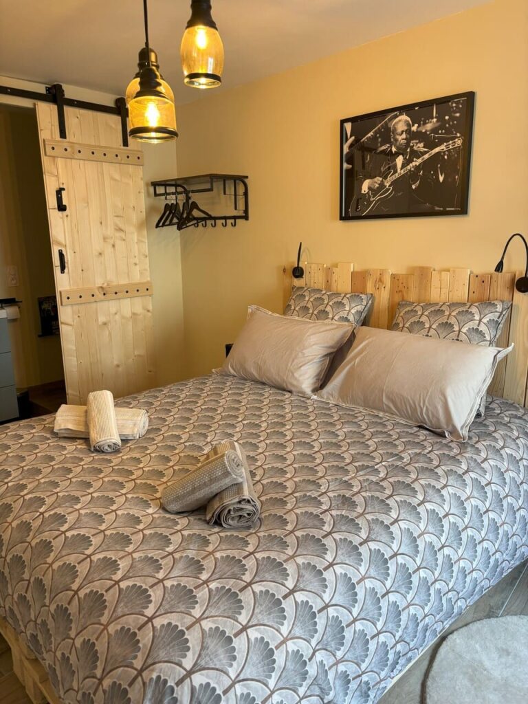 Chambre confortable avec lit Queen size (160×200 cm) et linge de lit fourni.